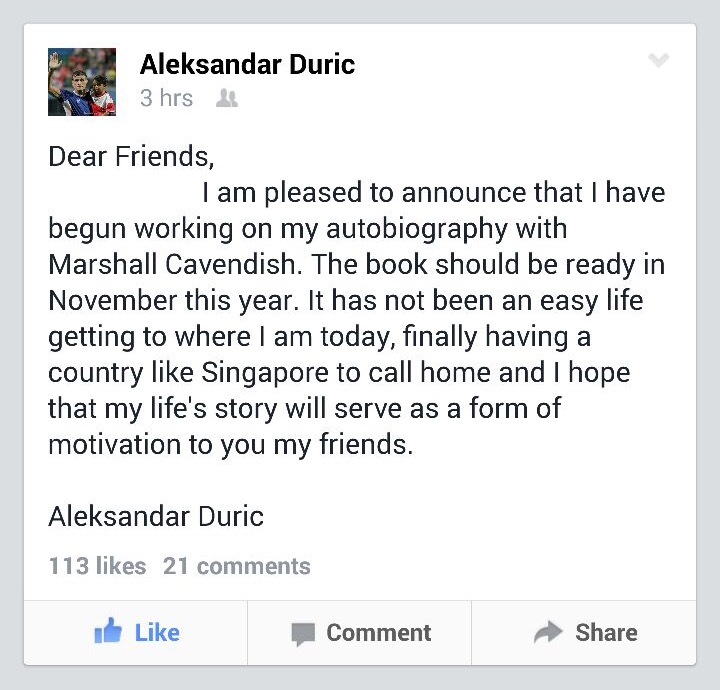Duric made an announcement on his Facebook page about plans on an autobiography, expected to be launched by the end of the year under the international publishing company Marshall Cavendish.