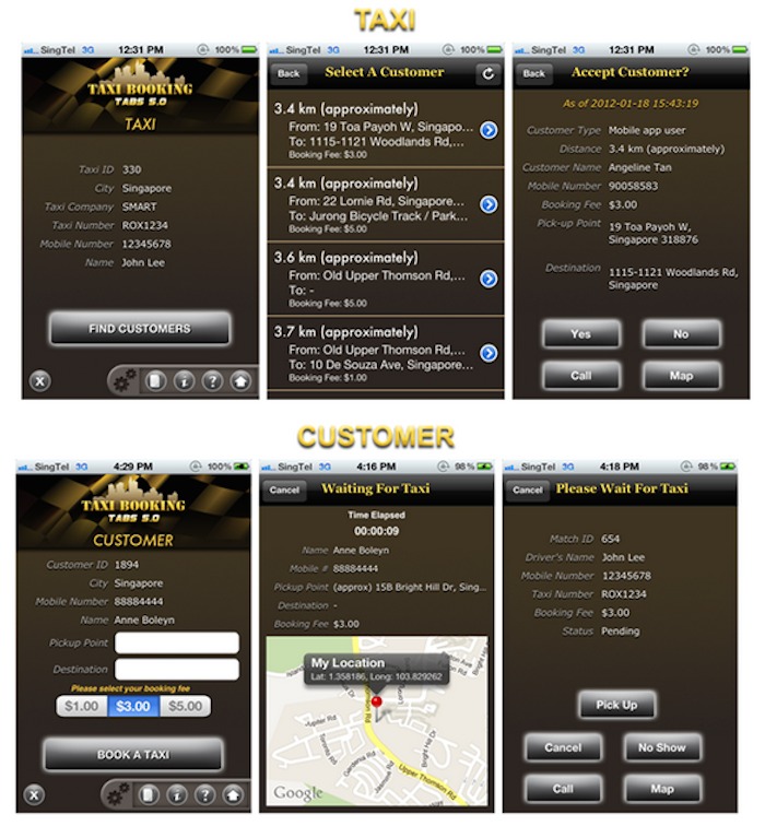 Taxi drivers can select any customer, call the customer on the phone, or view the map for the location of the customer. The service is free for drivers for the first 3 months, and subsequently a monthly fee of S$15 is applicable.
