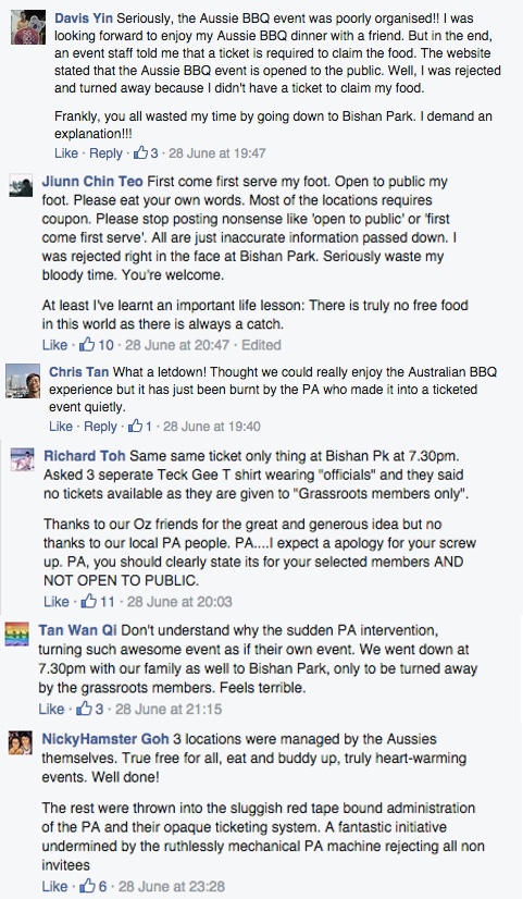 On the day itself, many were left sizzling in their own anger when they learned that attendance would be restricted by a ticketing system controlled by the People’s Association (PA) governmental statutory board, despite 50 BBQs previously being promoted as public event freely open to all.