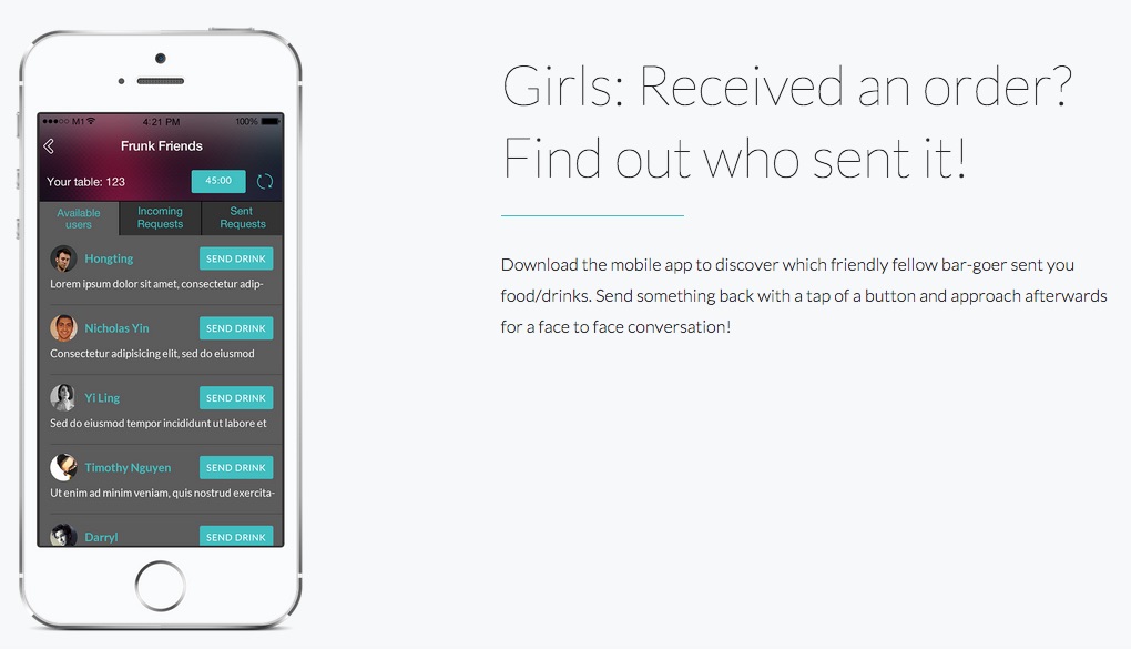 So while Frunk removes the social awkwardness that comes with potential rejection, if the person you bought the drink for accepts the drink and looks flattered, it probably means that you should go ahead and have a face-to-face conversation with him or her.