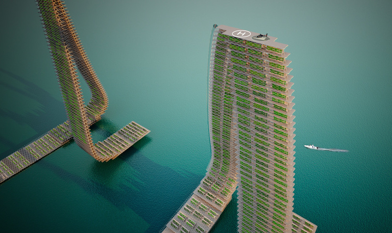 Barcelona-based architectural firm JAPA has designed a network of looping towers that will float on the shoreline to grow and cultivate crops in a pilot project destined here, according to ABC.