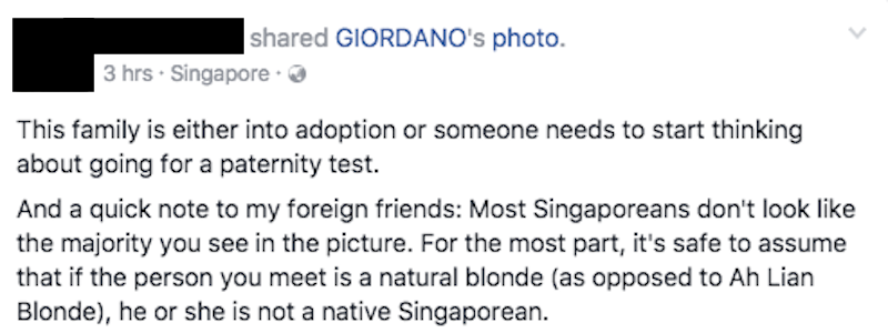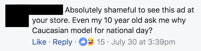 Geez, what an eyesore. First thing to address — folks are crying foul that an ad to promote a (rather ghastly) attire celebrating the country’s independence doesn’t feature “actual Singaporeans”, whatever that means. They’re mad that the typical Singaporean family aren’t the models for a National Day polo, and they take offence that an obviously Caucasian family (with their ambiguously Asian daughter) is used instead of a Chinese, Malay or Indian one.