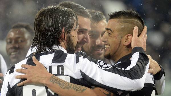 Photo: Quagliarella, Vidal and Pirlo celebrating their second goal in a match against Celtic FC last year; AFP