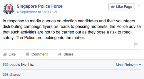 Imagine you’re driving when suddenly a troupe of folks in white outfits stop your car just to shake your hand and pass pamphlets to you. PAP candidates such as Dr Maliki Osman and Daryl David have been pictured walking dangerously in the middle of the roads just to distribute campaign flyers to passing motorists. Of course, it took media queries to get the Singapore Police Force to vault into action: