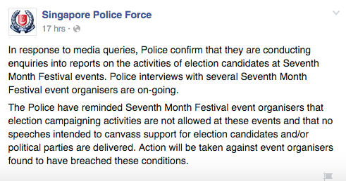 Earlier last month, the authorities have outrightly prohibited speeches and other actions intended to canvass support for election candidates or political parties at all Hungry Ghost Festival events, stipulated under the Public Order (Election Meetings) regulations 2009.