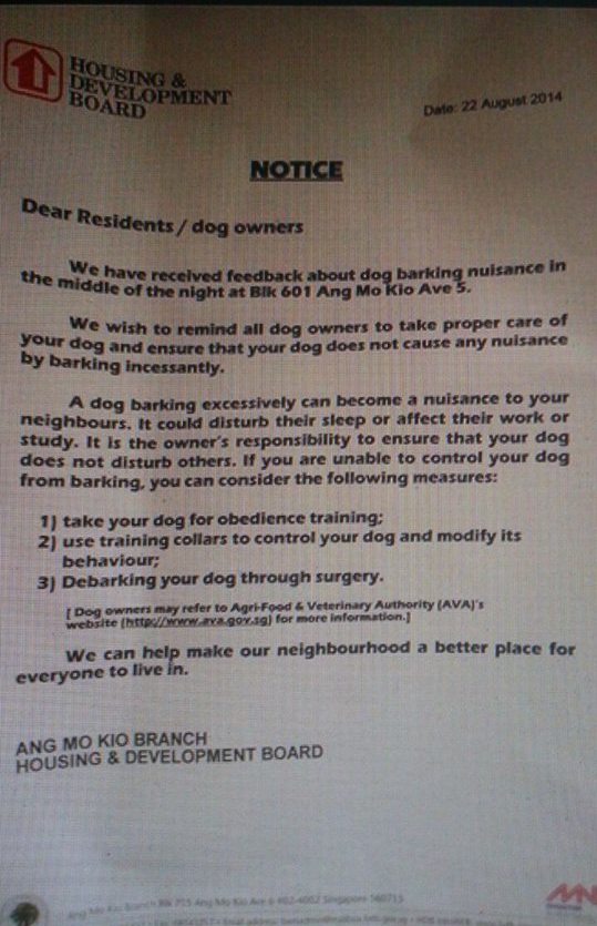 In it, the authorities advise dog owners with loudly barking dogs to ‘permanently mute’ them, in response to feedback about a “dog barking nuisance in the middle of the night” in an Ang Mo Kio flat.