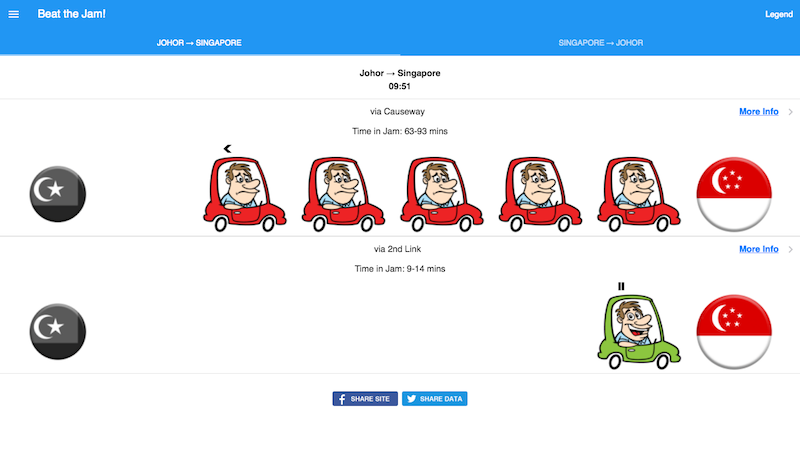 Called Causewayjam.com (obviously), the site was launched last month by Hayden Lak, reports The Straits Times. A Malaysian and Singapore permanent resident with a tech business here, the 35-year-old is no stranger to long commutes. The app was created in a month, using traffic data streamed from Google. Plans to offer downloadable iOS and Android versions are slated for next month.