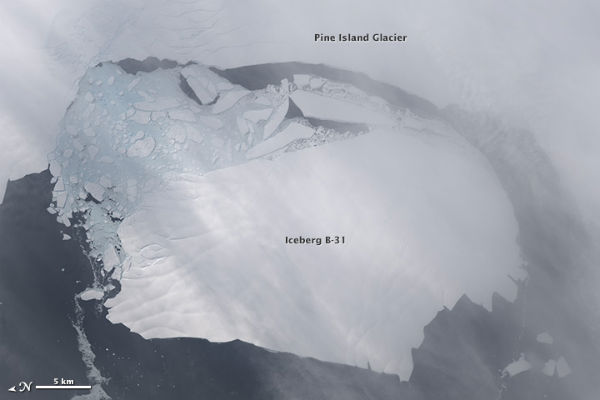 Iceberg B-31, named so by the US National Ice Center, has finally split completely from the Pine Island Glacier (PIG) in Antarctica and is now moving through the Southern Ocean.