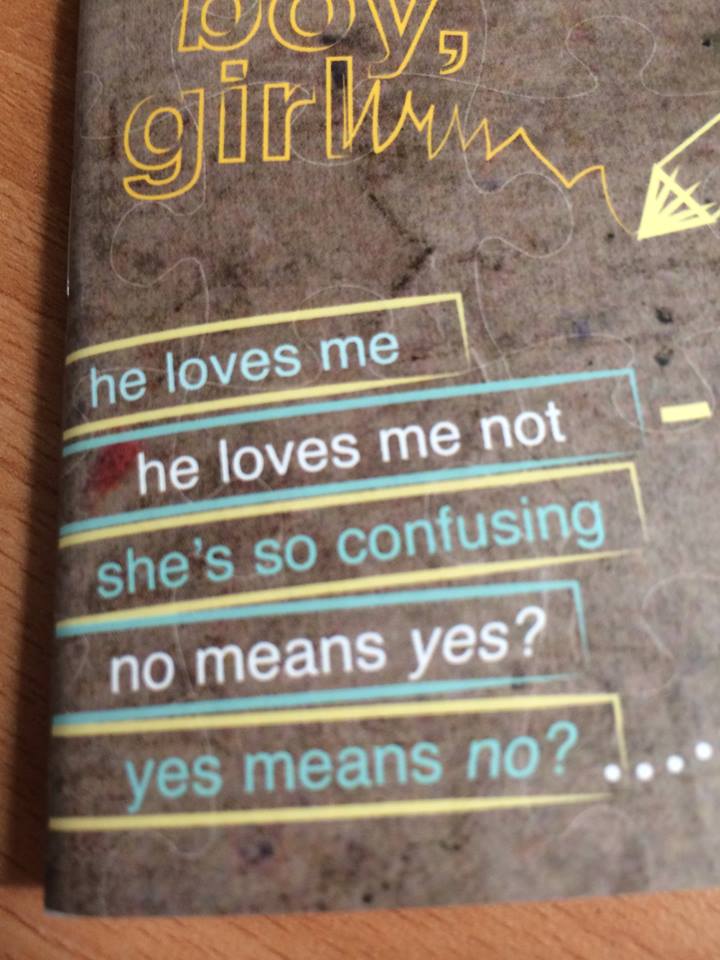 While I do have many concerns with regards to this workshop and its content which I consider to be pressing, the most pressing is perhaps that the workshop and booklet actively serve to promote rape culture in school. On the cover page of the booklet itself, it is written, “no means yes?” and “yes means no?” (See attached photo for reference.) The facilitators from FotF neglected to mention that thinking a girl means “yes” when she says “no” is actually completely wrong. Rather, they spent their four hours with us discussing things such as what a girl “really means” when she says something else, as opposed to guys who are “direct” and “always mean what they say” (see photos of pages 20-21). By telling the student population this, FotF sends a dangerous message: that you should always assume that a girl means something else (like “yes”) when really she just means “no”.