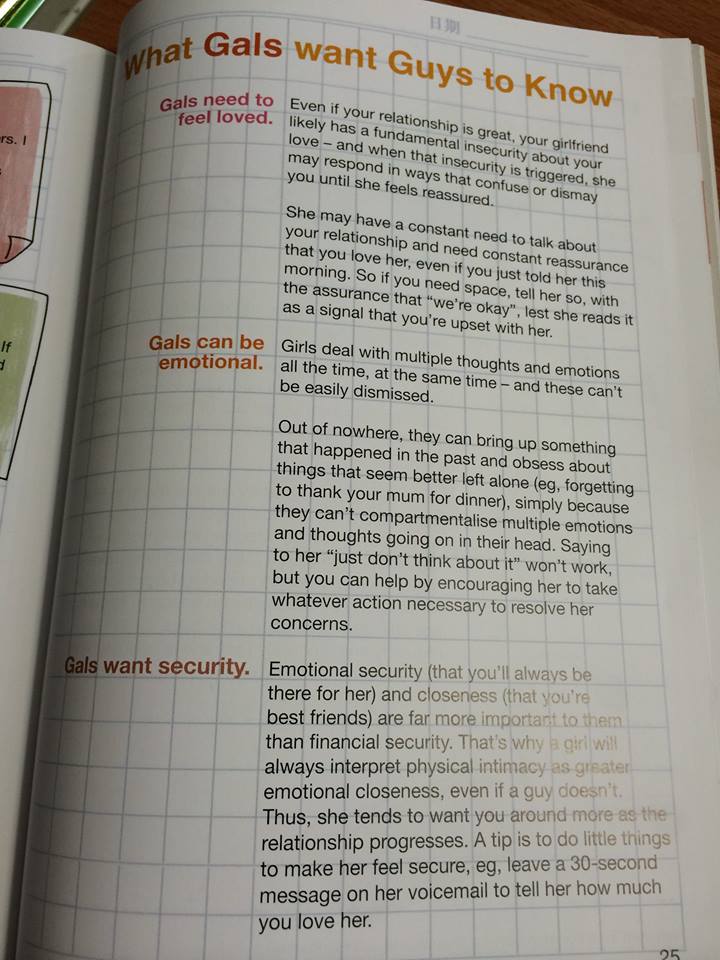 Guys, on the other hand, are portrayed as guardians who can ultimately do no wrong even when they are evidently doing wrong. “Guys need respect” and “guys are insecure” are just some of the things written in the booklet.
