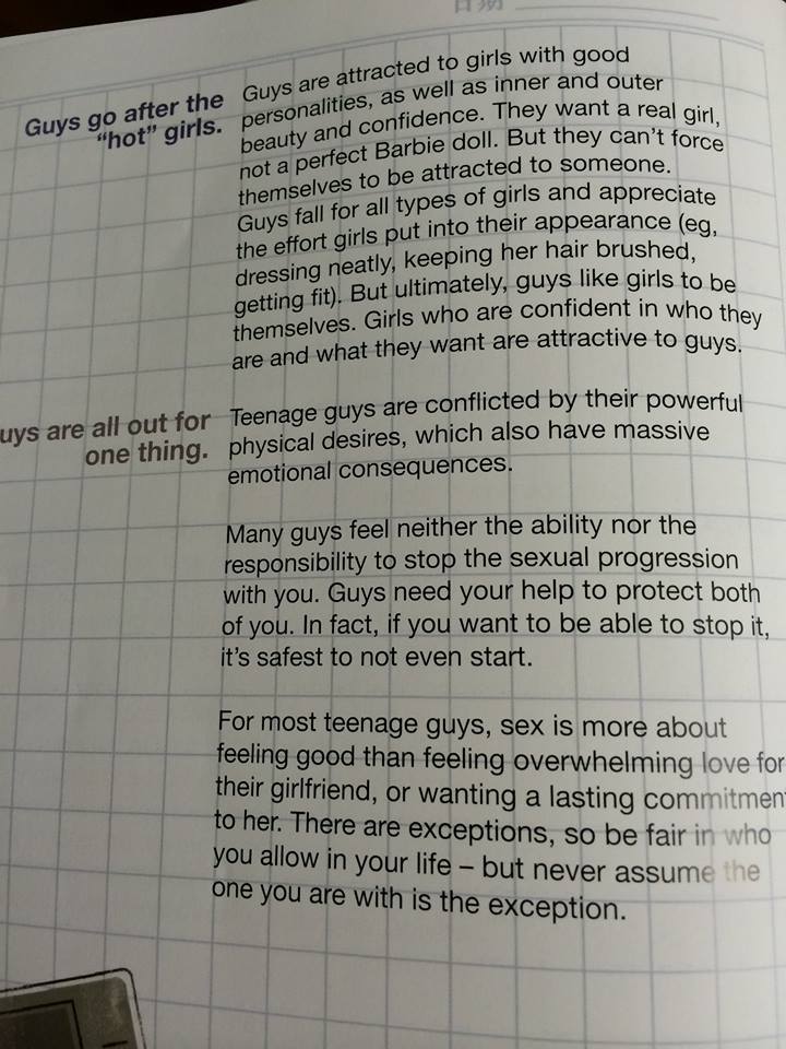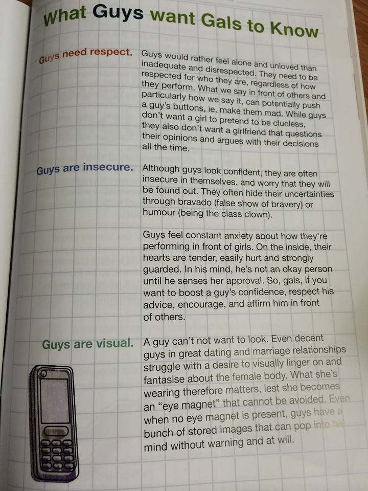 According to FotF, “gals” –as it is written throughout the booklet –are fragile and need guys’ support, and everything a guy does in the relationship is excusable simply because he is a guy and is wired that way. “Gals”, it writes, “need to be loved”, “can be emotional”, “want security”, “[want] you to listen to her problems”, and “[want] to look attractive”, and validation of each of these can only come from the support of a male (see attached photos of pages 25-26). It paints girls as hopelessly dependent beings who are incapable of surviving without guys. This is an extremely sexist view.