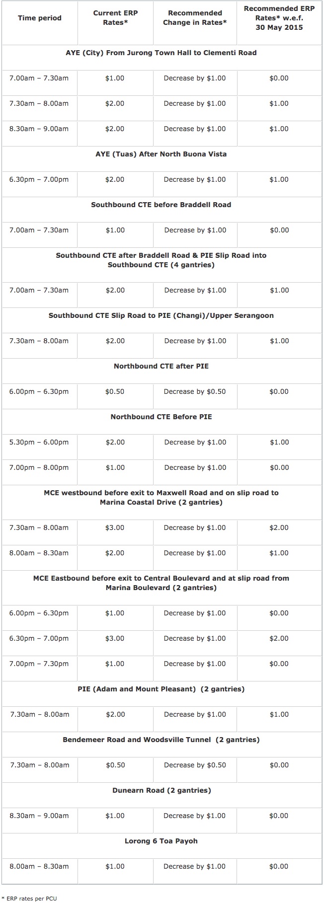 Motorists will be glad to know that ERP rates at selected roads and expressways during certain time periods will be reduced by $1, except where the current ERP rate is $0.50. If the gantries are not listed in the table below, that means no reduction. Rates will revert back to normal (ie, expensive) from 29 June onwards.