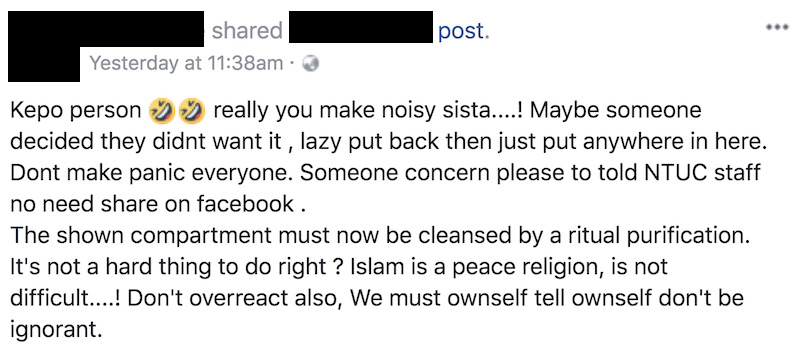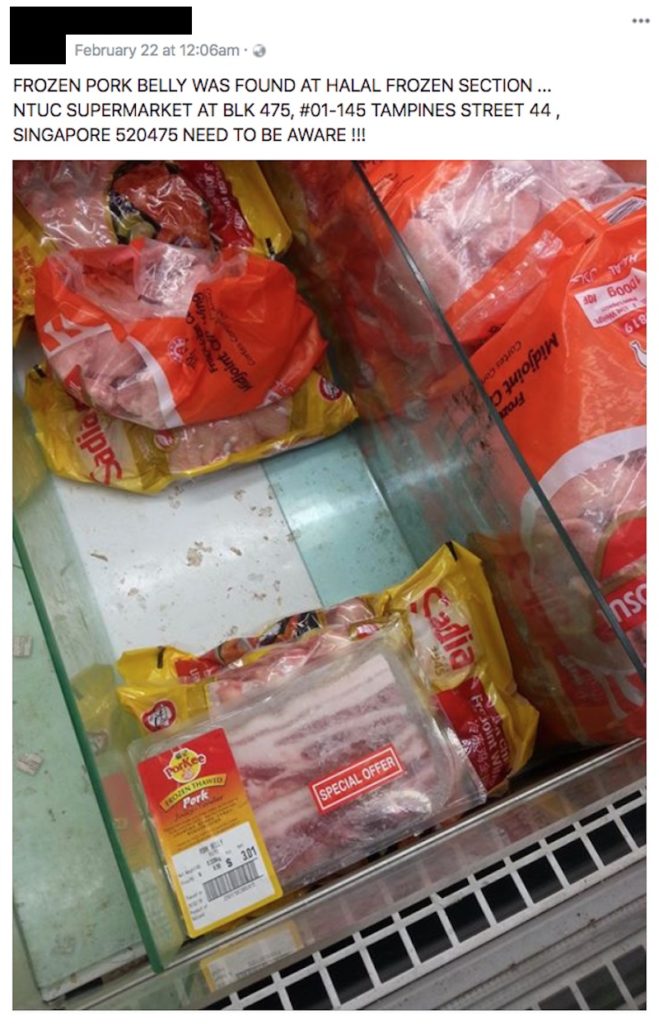 ’Twas much ado about nothing when a lady got so triggered at the sight of a sealed packet of frozen pork in the halal frozen food section that she had to post about it on Facebook (IN ALL CAPS, EVEN). Her post called for fellow Muslims to be aware of the wicked, conniving NTUC Fairprice supermarket in Tampines that dared to trick the innocent into buying pork belly as part of some conspiracy against Muslims.