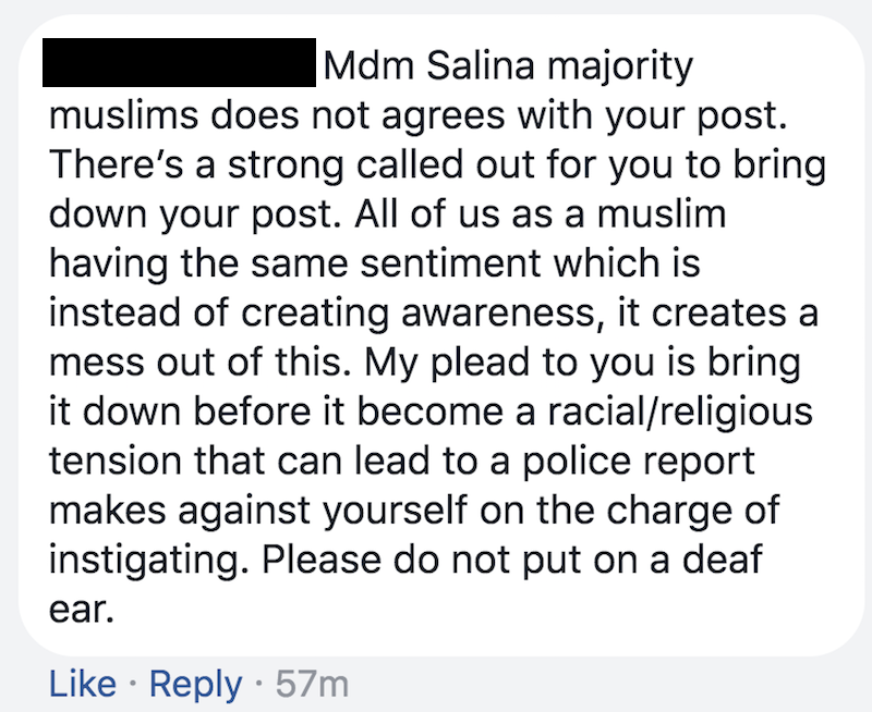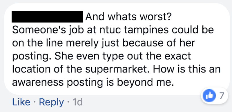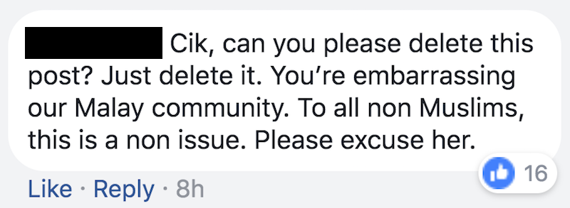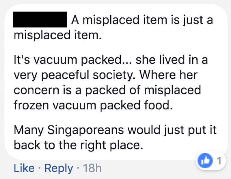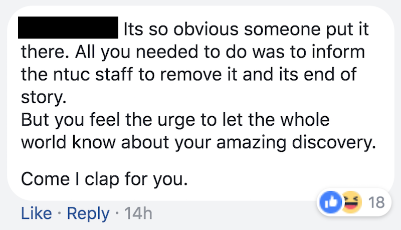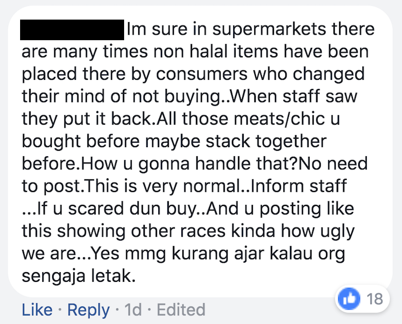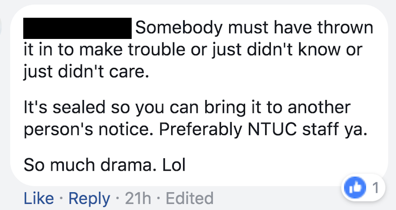 - Instead of causing unnecessary drama on Facebook, she could’ve just picked up the packet and put it somewhere appropriate. If she was too afraid to pick it up (because haram), she could’ve just asked a supermarket staff to help return it to its original location.