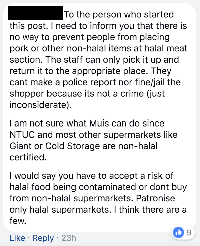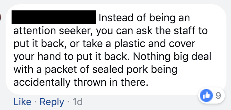 ’Twas much ado about nothing when a lady got so triggered at the sight of a sealed packet of frozen pork in the halal frozen food section that she had to post about it on Facebook (IN ALL CAPS, EVEN). Her post called for fellow Muslims to be aware of the wicked, conniving NTUC Fairprice supermarket in Tampines that dared to trick the innocent into buying pork belly as part of some conspiracy against Muslims.