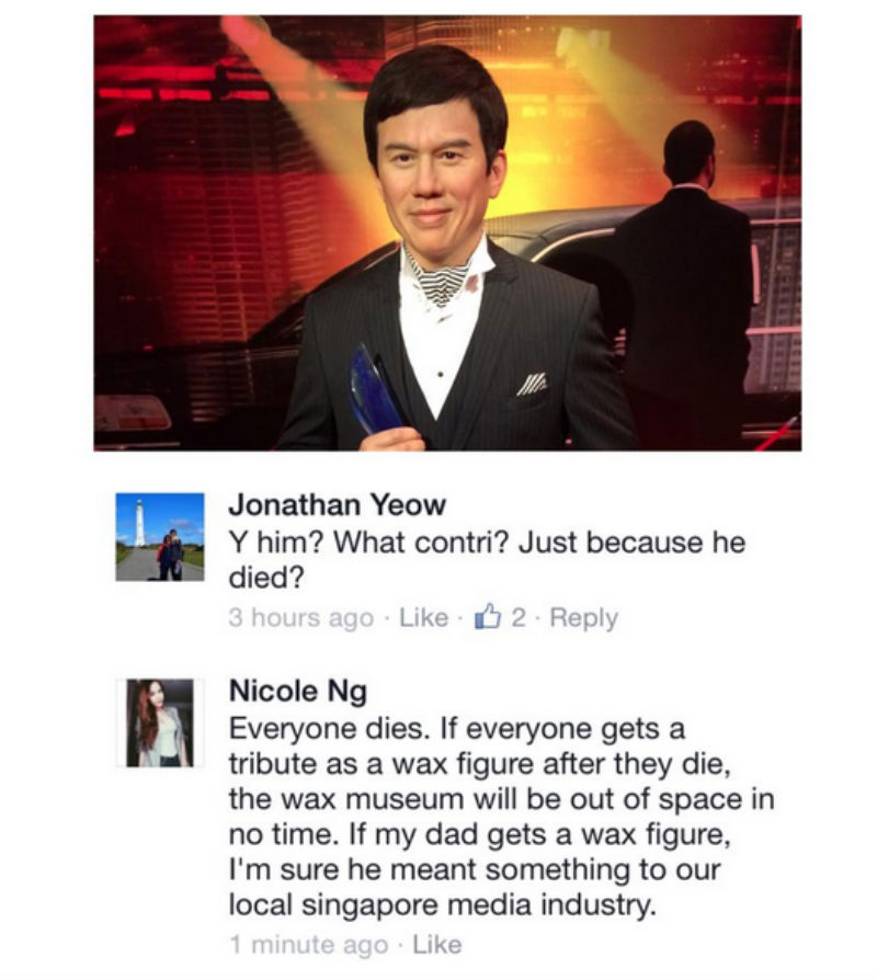 Yesterday, she uploaded on Facebook a screenshot of a comment made by an insensitive netizen, who questioned her father’s significance such that he was given his own figure at the renowned museum. She also included her response to the original comment: