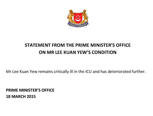 Following yesterday’s announcement that Lee Kuan Yew’s condition took a turn for the worse due to an infection, it looks to be that his health has slumped further.