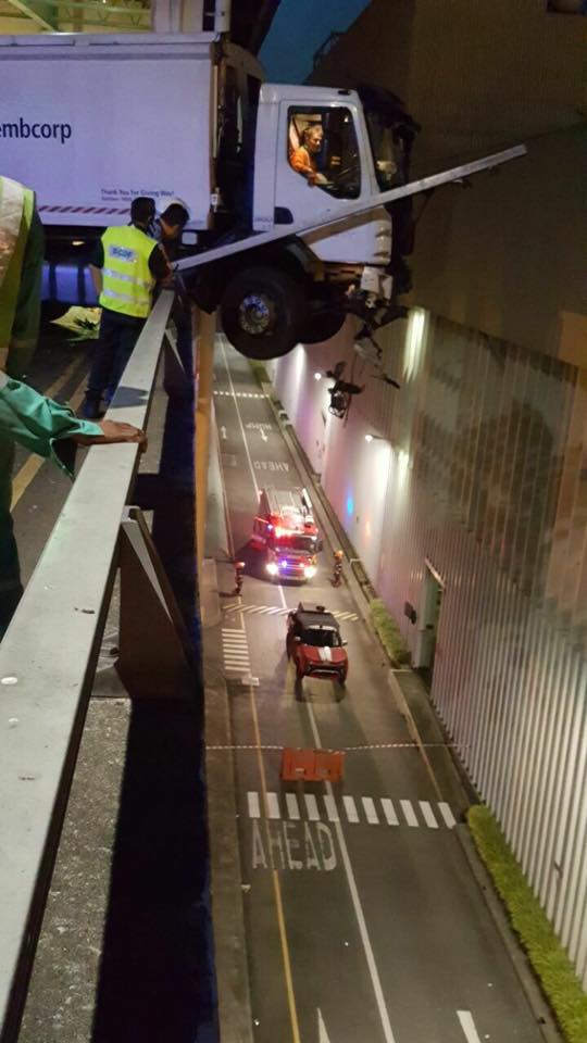 It’s unclear how the accident happened in the first place, but the Sembcorp truck apparently went over a railing of an incineration complex in Senoko, leaving the driver’s cabin and its front tires hanging in mid-air.