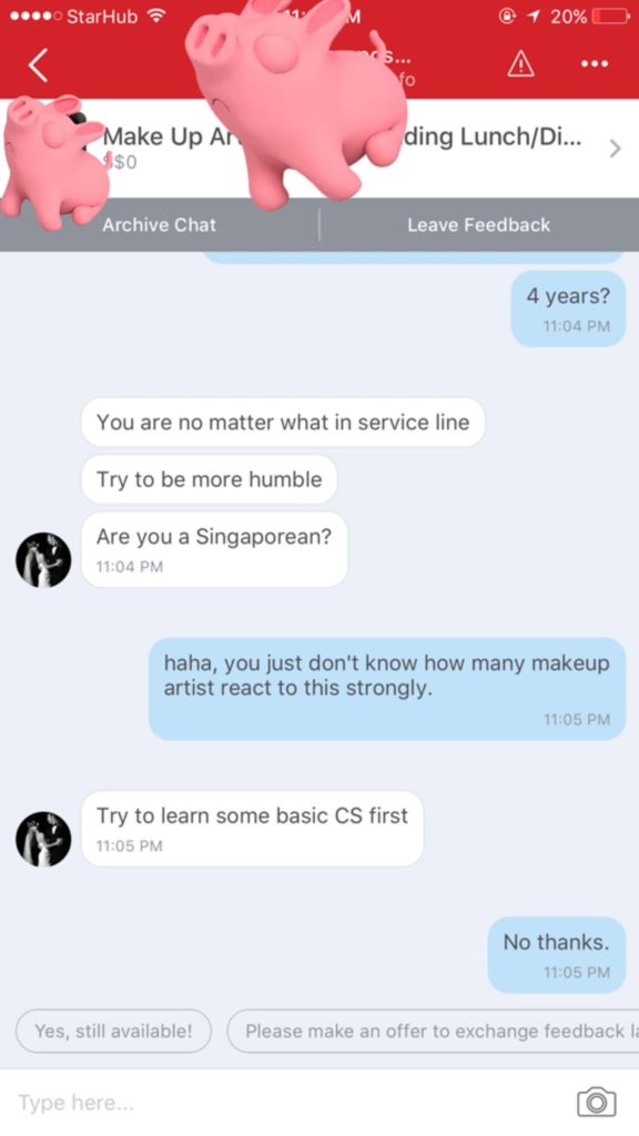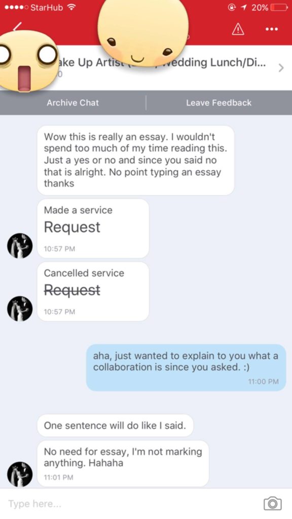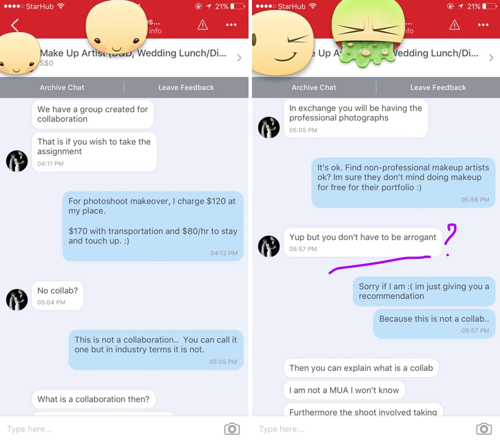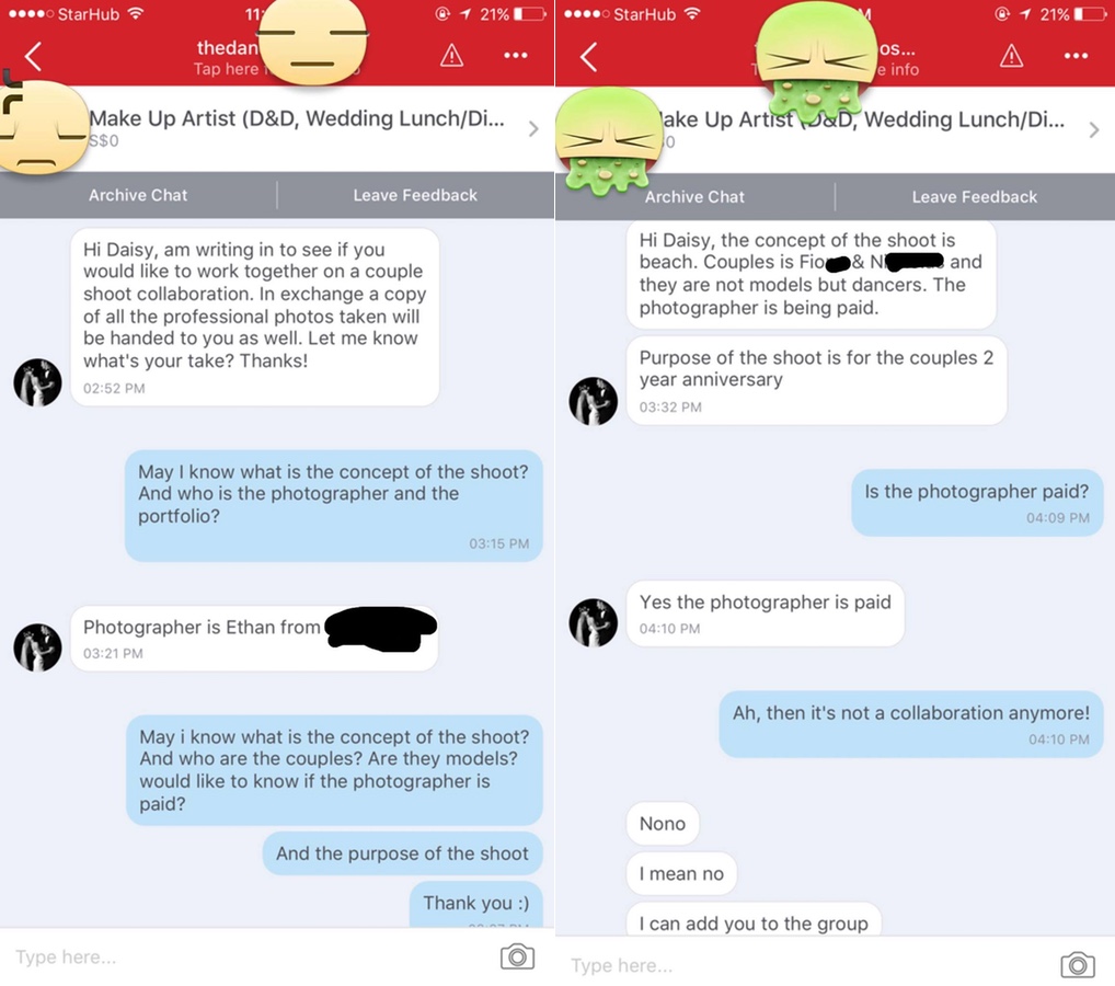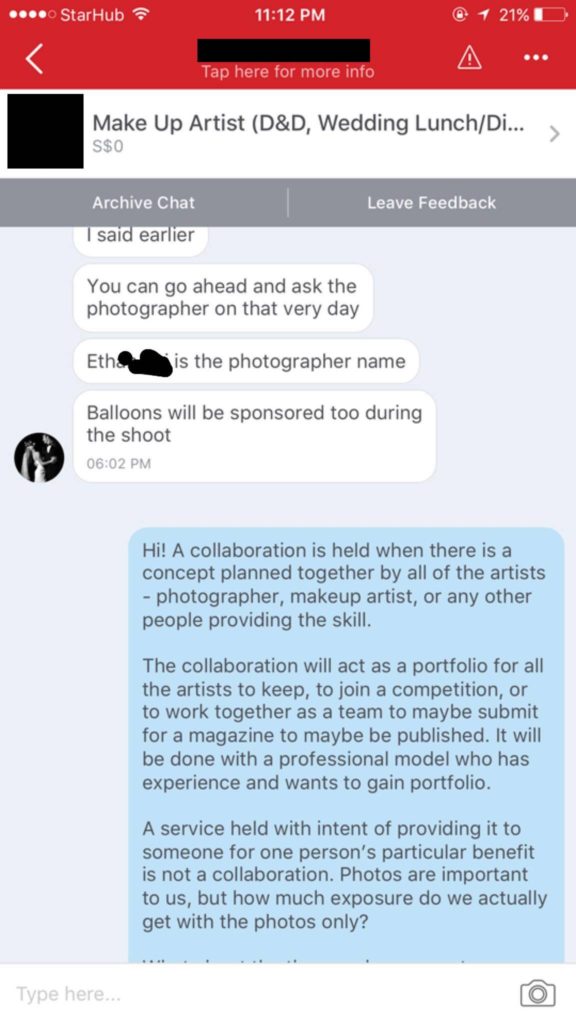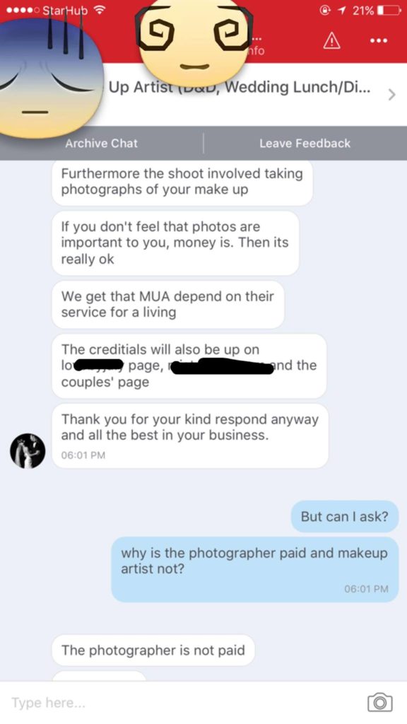 Professional makeup artist Daisy Wong was asked through online marketplace Carousell to provide makeup services for a couple doing a photoshoot for their second anniversary as part of a collaboration. The cheapskate Carouseller, whose identity was not revealed, apparently thought it would be a great idea to pay her by offering her free “exposure” (ugh). Instead of fees, Wong would get a full set of photos from the shoot to use as ‘marketing material’.