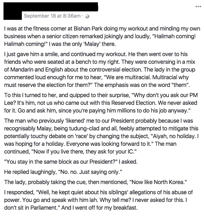 Thus, we couldn’t be too shocked to see bigoted sentiments leaking out loud post-election. A “tudung-clad” Malay woman claimed to have been recently subjected to passive aggressive put-downs while minding her own business at Bishan Park. Despite not having anything to do with the political kerfuffle, she was called “Halimah” and received less than subtle remarks about the controversial election.