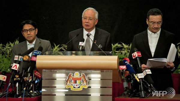 Photo: Malaysian Prime Minister Najib Razak at the late press conference in Kuala Lumpur, where he delivered a statement about MH370’s last known location in the Indian Ocean; Mohd Rasfan / AFP