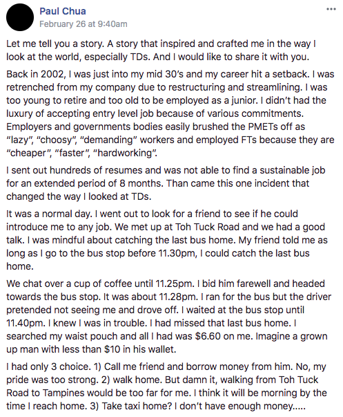 One day, after meeting a friend at Toh Tuck Road, Chua missed the last bus home. With only $6.60 in his wallet, he mulled over his choices — lay down his pride and ask his friend to loan him money, walk all the way home to Tampines, or take a taxi back.