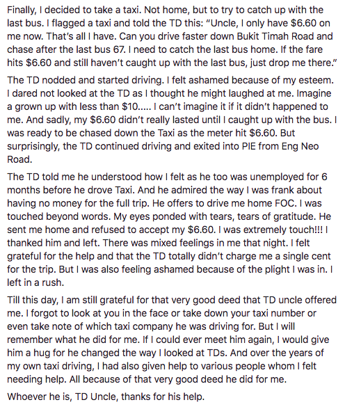 But to his surprise, when the fare hit $6.60 and the bus was nowhere in sight, the cabbie still continued driving him home. Explaining that he empathized with Chua’s plight, the driver said that he too had been unemployed for six months before he started working as a cabbie. He then offered Chua a free ride home.
