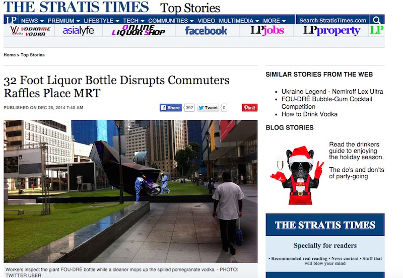 Crafted to look like an exact replica of the Straits Times website, the clearly fake article details a story about a 32 foot promotional Fou-Dre vodka bottle breaking apart during its installation at Raffles Green, spilling an estimated “200 liters of pomegranate vodka”.