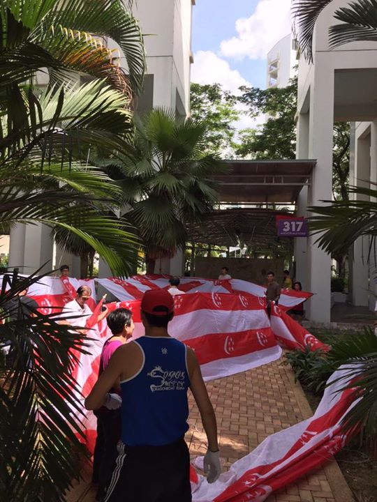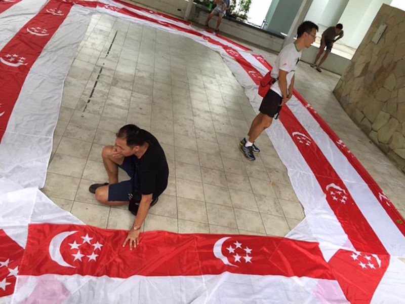 In an effort to set up a humungous display celebrating the nation’s jubilee, Minister of State for Health and Member of Parliament for Sengkang West Single Member Constituency Dr. Lam Pin Min called upon a group of volunteers to form up Singapore flags into a big-ass ’50’ sign. In the process however, the flags were indisputably soiled when it was laid on the ground and scrunched up amongst the shrubbery.
