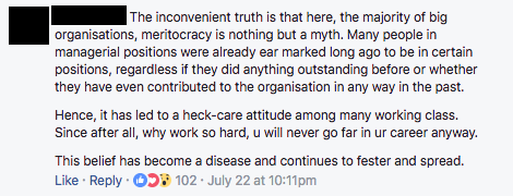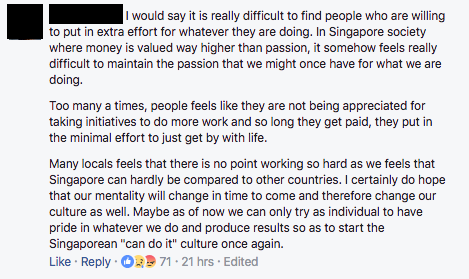 From the number of people who heard her call and answered with their own experiences, it was clear that Chong wasn’t the only one frustrated with the lack of passion and drive in Singapore’s workplace — although there were also those who delved into the reasons behind the culture of the “heck care attitude”.
