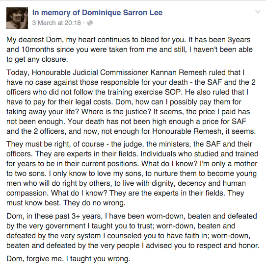 The despair was palpable, of course, and provoked public outcry. SAF had to assure the public that the two officers that were in charge during Dominique’s fatal accident had indeed been punished according to military law, even though they escaped criminal conviction.