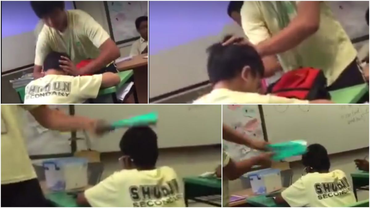 The video, taken at Shuqun Secondary School in Jurong East, shows a male student repeatedy a classmate on the head and later slapping the boy on the cheek and then hitting him and another classmate on the head with a book. All this while the rest of the class were laughing in the background.