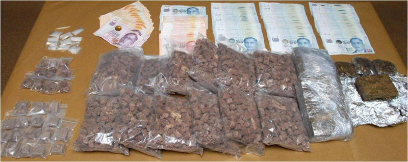 The two Singaporean males were arrested at a commercial building in Geylang; believed to be the syndicate’s hideout. Police seized 535g of heroin from the car the suspects were found in. Another 5.5kg of heroin, 1.3kg of cannabis, and various other drugs were confiscated from their unit in the building.