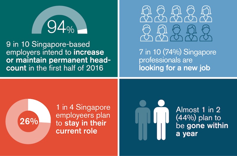 Employees in Singapore are also feeling like they should be on the move, with 34 percent of the 758 people surveyed being active in looking for a new job, while 40 percent are passively seeking one. The restlessness is palpable to the point that 65 percent of the employees surveyed would even consider moving to other countries for work, with Australia, the United States and China as their top three choices.