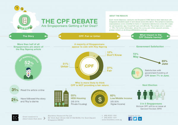 The survey cites this as a possible reason satisfaction with the government has dropped from 72 percent to 65 percent from May to June this year, and predicts CPF will be an issue in the 2016 General Election.