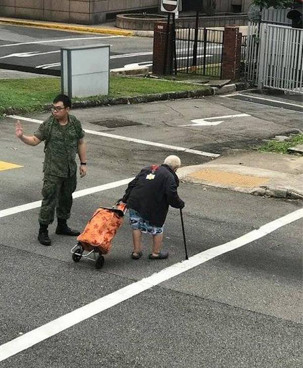 Last Friday, a picture of the SAF National Serviceman was shared across a few social media pages — a heartwarming image of him holding his hand up to traffic in a bid to let a frail-looking elderly woman cross a road safely.