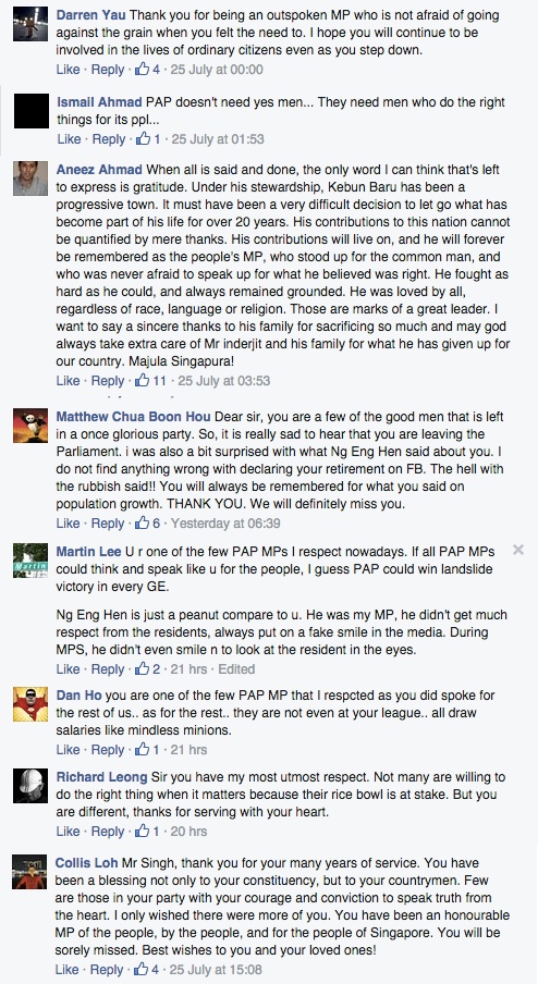 Minister for Defence and MP for Bishan-Toa Payoh GRC Dr. Ng Eng Hen however was not too happy with how Singh announced his retirement. Channel NewsAsia reports that he would prefer if MPs stepped down from their positions in a “more deliberate and a dignified manner”, directly referencing Singh’s Facebook post.