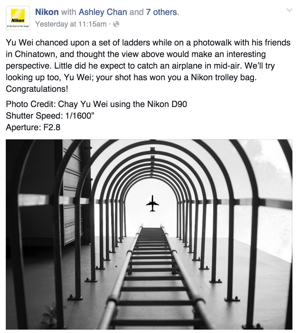 “Yu Wei chanced upon a set of ladders while on a photowalk with his friends in Chinatown, and thought the view above would make an interesting perspective. Little did he expect to catch an airplane in mid-air. We’ll try looking up too, Yu Wei; your shot has won you a Nikon trolley bag. Congratulations!” the venerable photography brand said in a post on their Singapore Facebook page.