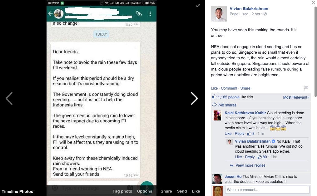 Minister for Environment and Water Resources Dr Vivian Balakrishnan denied rumours being passed around on a messaging app purportedly written by “a friend working in NEA” warning people to avoid the “chemically-induced rain showers” until the F1 weekend is over.