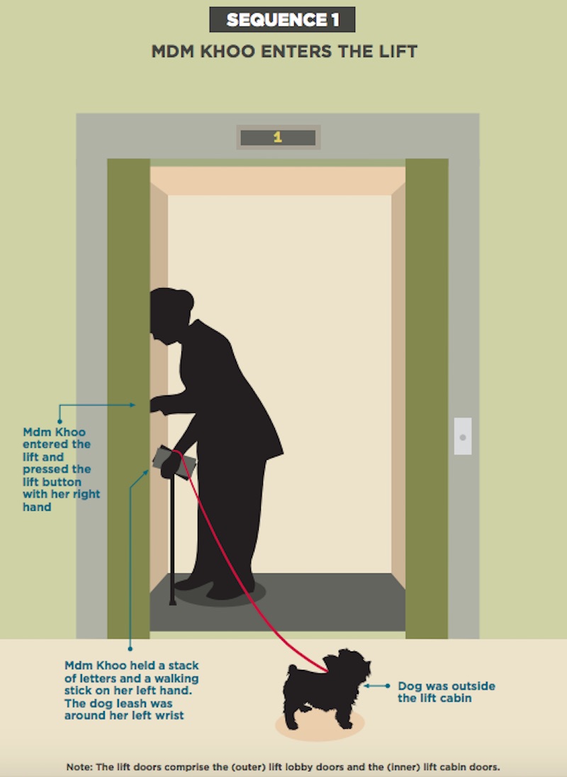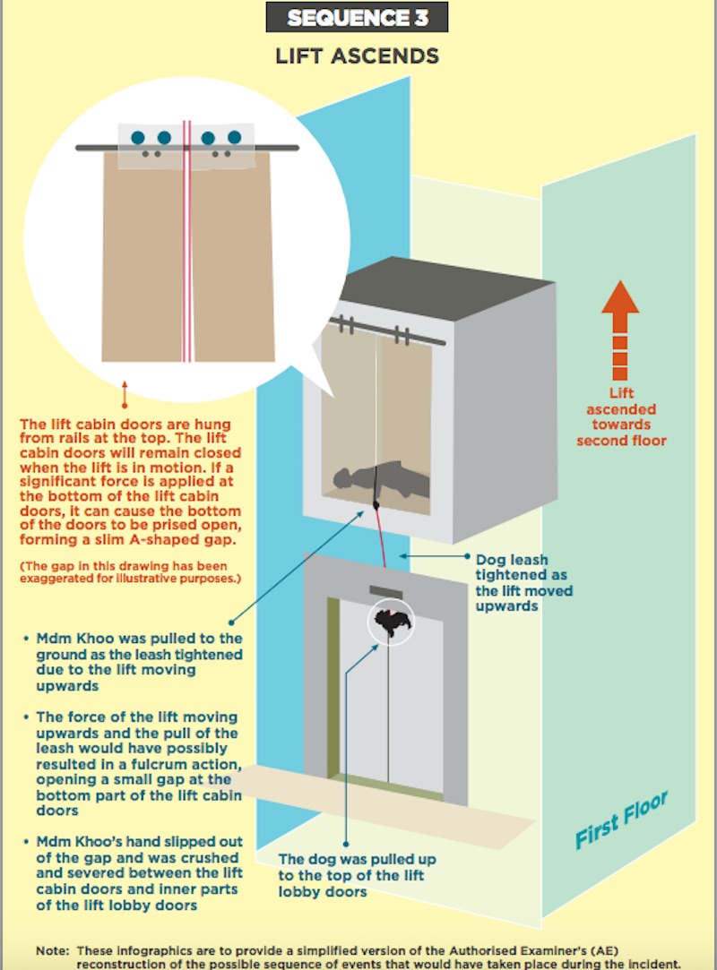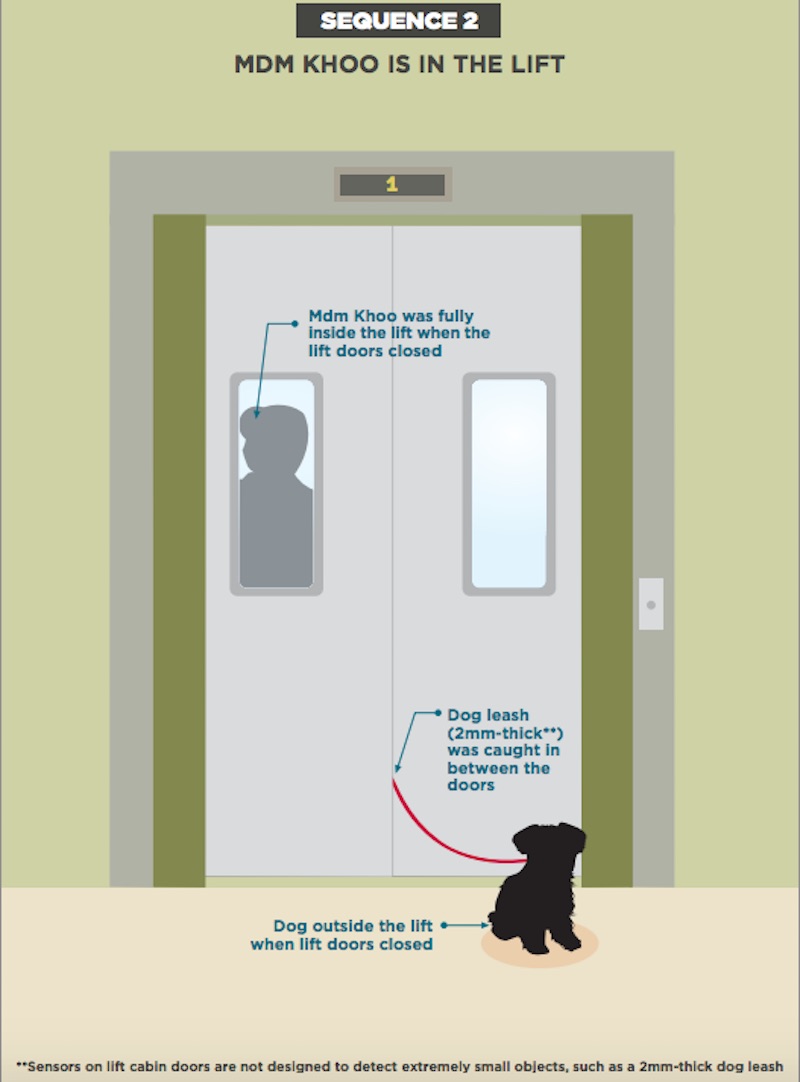 After reviewing all the evidence, CCTV footage, specialist medical reports and interviews — as well as inspections and simulations — the AE found that the 85-year-old Khoo Bee Hua’s traumatic injury was a self-inflicted one. Her hand had been severed as it was pulled by the leash through the lift cabin doors when they closed while her dog was still outside. Here are some illustrations courtesy of the Building and Construction Authority (BCA) showing how it happened.