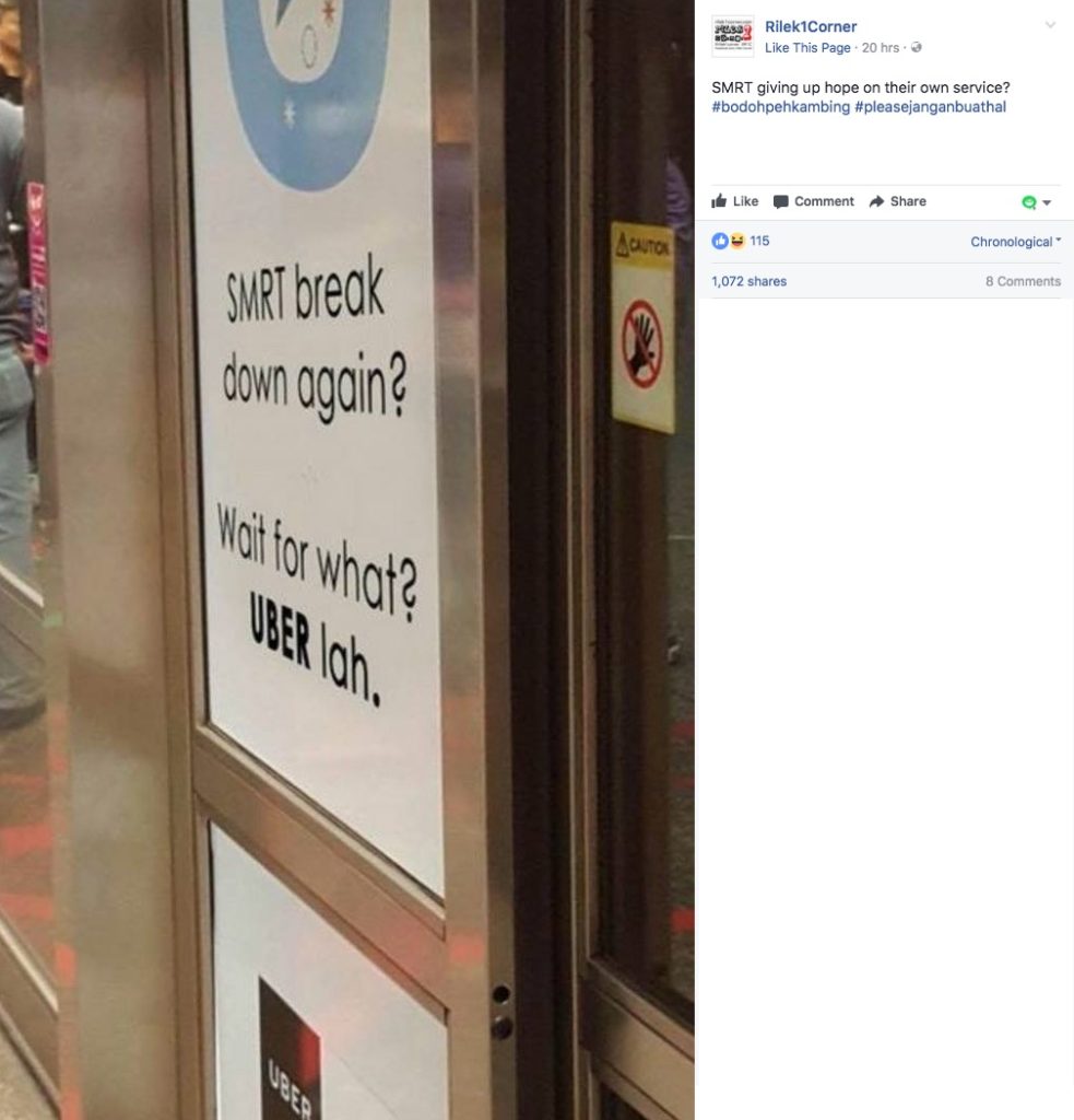 Given the spate of recent train breakdowns on the North-South Line, frustrated netizens have been spreading around this image that seems to depict Uber making fun of SMRT’s constant breakdowns — in an advertisement for its services. One that’s placed at a station platform, even.