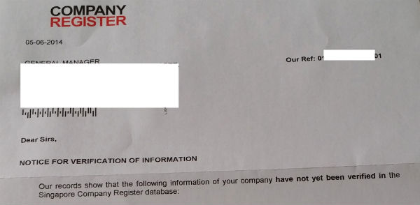 Business owners, beware — a letter from one “Singapore Company Register” is making its rounds in the mailbox.