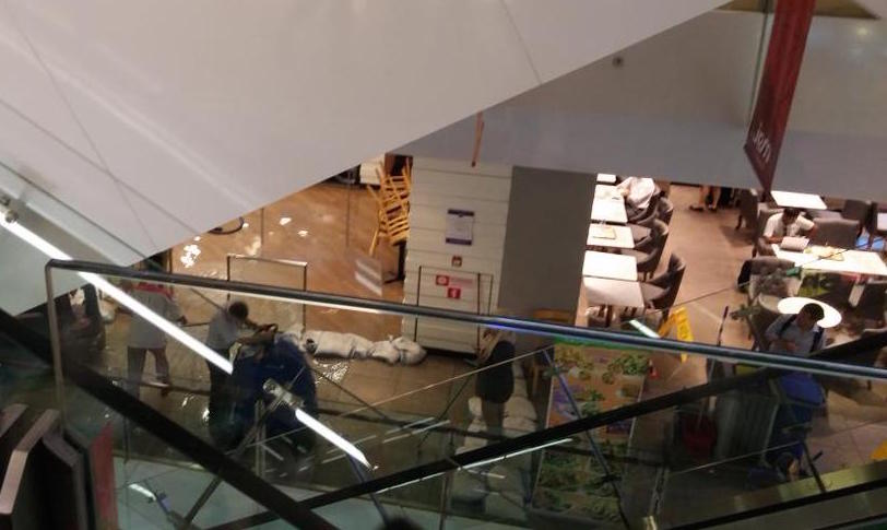 When reporters visited the mall yesterday night, workers were mopping up outside the shop, with sandbags set up to prevent the water from flowing into other units.