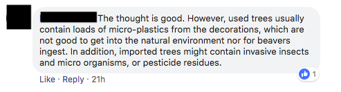 So anyway, The Beavs and his buddies at Wildlife Reserves Singapore are apparently always on the lookout for natural goodies to gnaw on, scratch, sniff, or play with. And last Friday, one netizen put out a call for “real, lush and green Christmas tree[s]” on behalf of JBeav.
