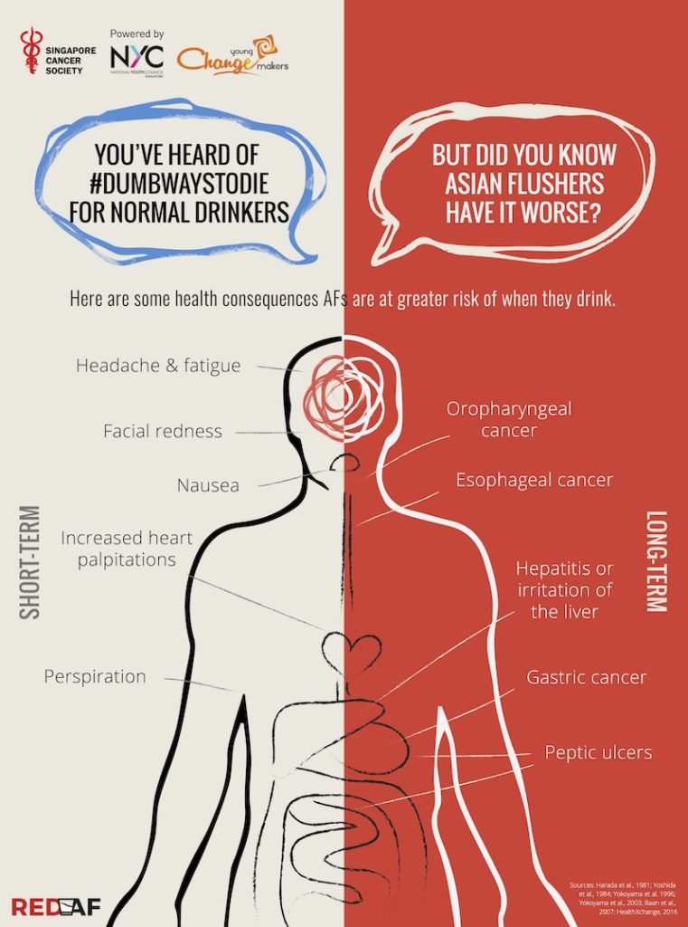 You already know what it is. A condition experienced by a majority of those of East Asian descent, it happens when blotches of red turn up on one’s face, neck, and other parts of the body after consuming alcoholic beverages. Through a campaign entitled “RED AF”, a team of four NTU undergrads aims to raise awareness and educate young adults on the Asian Flush and its deeper health implications.