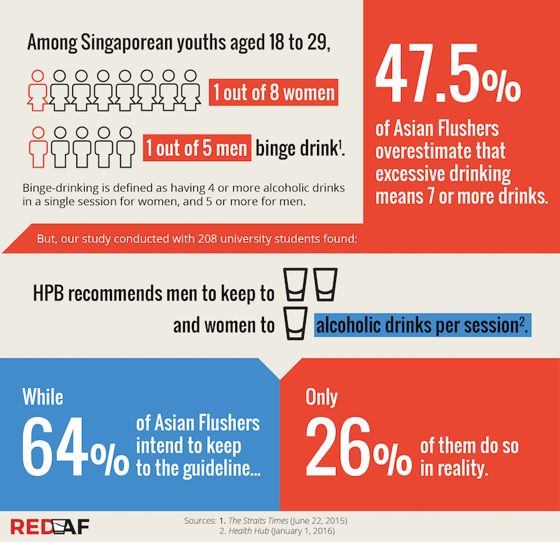 Even though 64.4 percent of the respondents intended to keep to the Health Promotion Board’s drinking guidelines (a maximum of one drink for women a day and two drinks for men a day), only 26.3 percent actually succeeded in doing so. A worrying statistic, as an Asian flusher’s threshold for binge-drinking is even lower than a non-flusher.