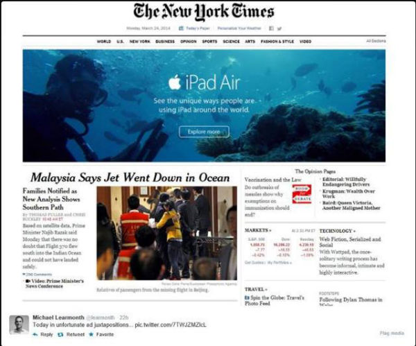 Remember when New York Times ran an ad for iPad Air that promoted its underwater use right above the announcement of MH370’s ocean demise?
