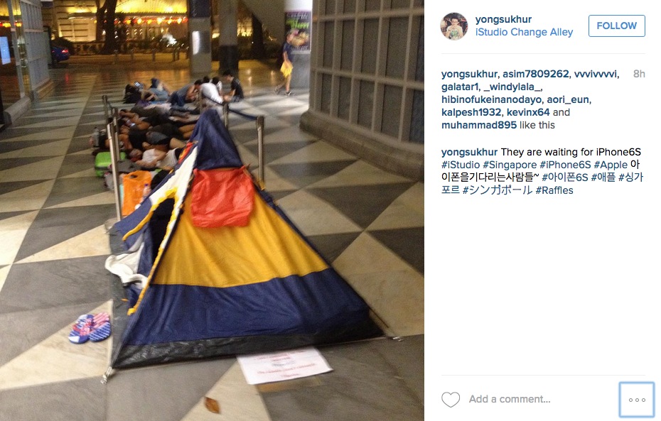 The image above, posted by Instagram user yongsukhur, shows people camping at Change Alley in Raffles Place. Let’s hope the iPhone 6s takes better photos.