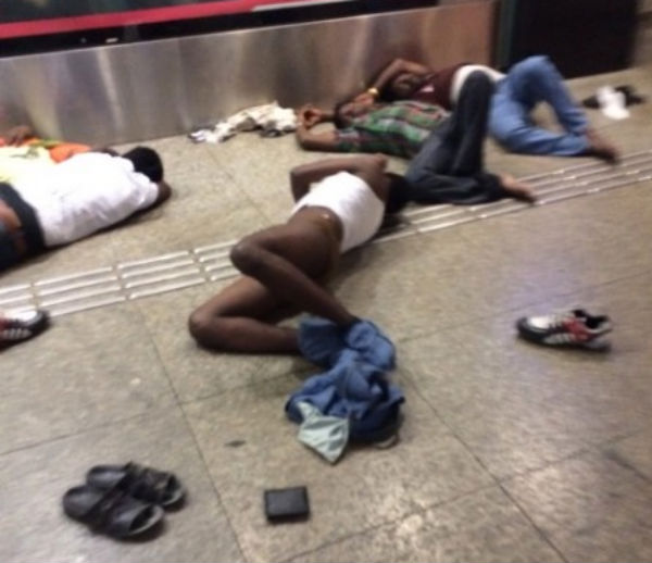 Six or seven foreign workers, sprawled across the floor at Bugis MRT station with their shoes — and for one, his pants — loose.