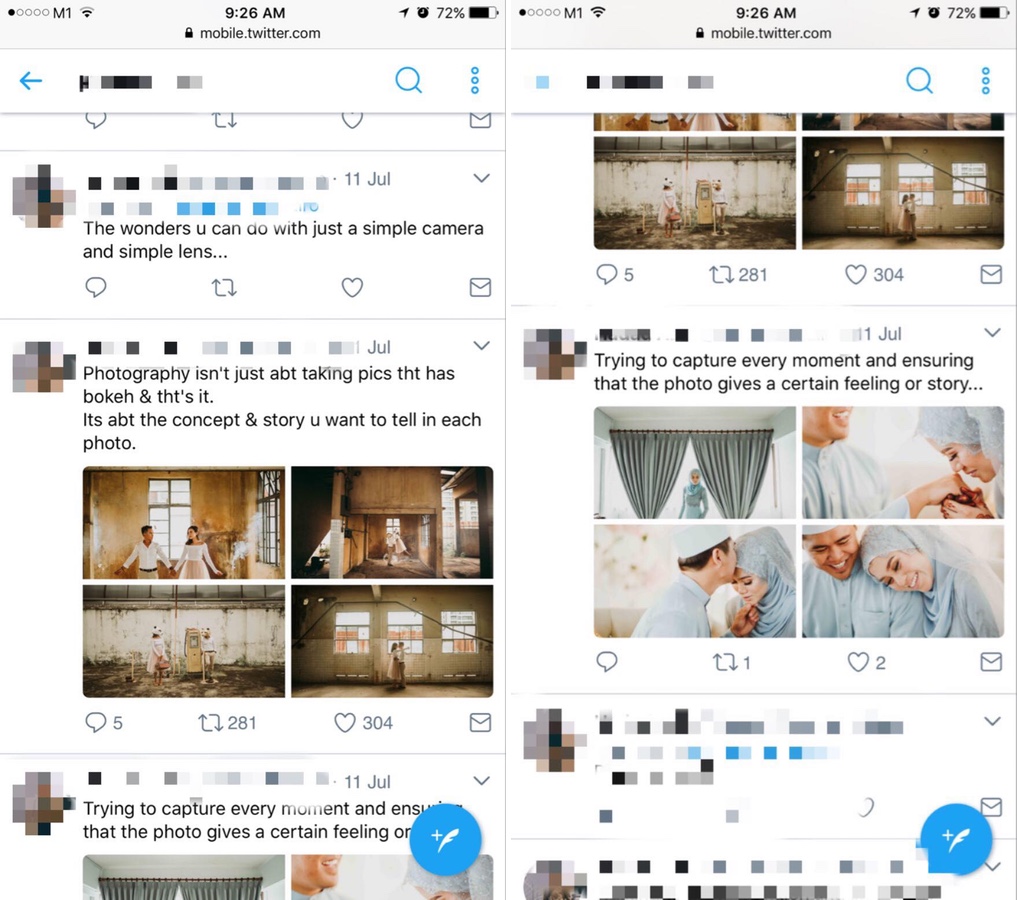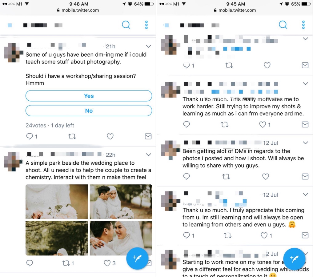 As it turned out, maybe he should have. This morning, he received a text from one of his clients saying that the fauxtographer had put up the stolen images on Twitter, accompanied by shameless captions like “post processing another couple wedding photos, keep a lookout”. No more crediting or vague posts about the pictures’ origins — this was blatant misappropriation.